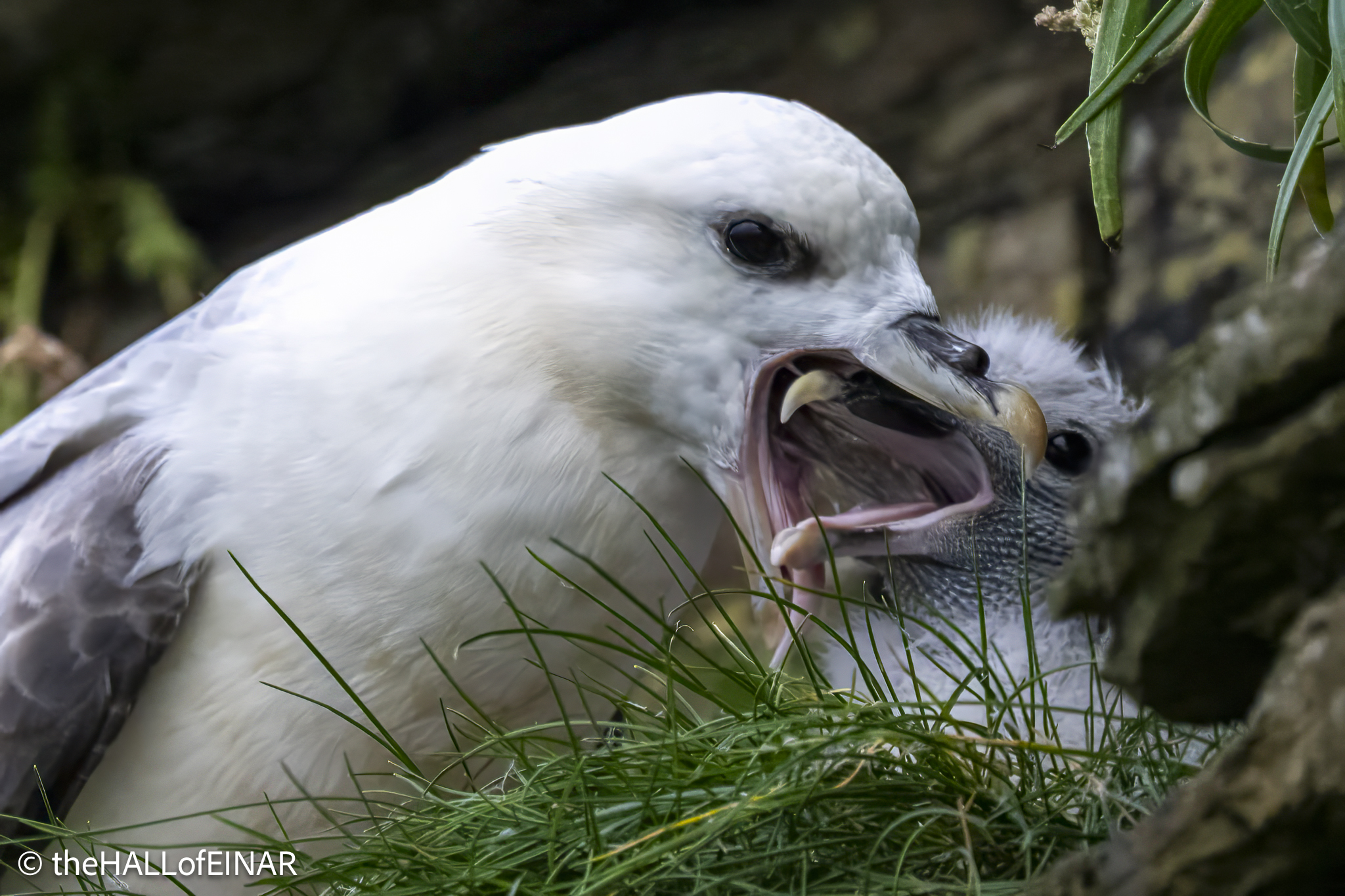 It’s rare that I get close photographs of Fulmars eating. They’re normally well offshore when I see them feasting on something. This adult has clearly been successful because it’s come back to feed its chick. It’s regurgitating food carefully into its chicks small beak.